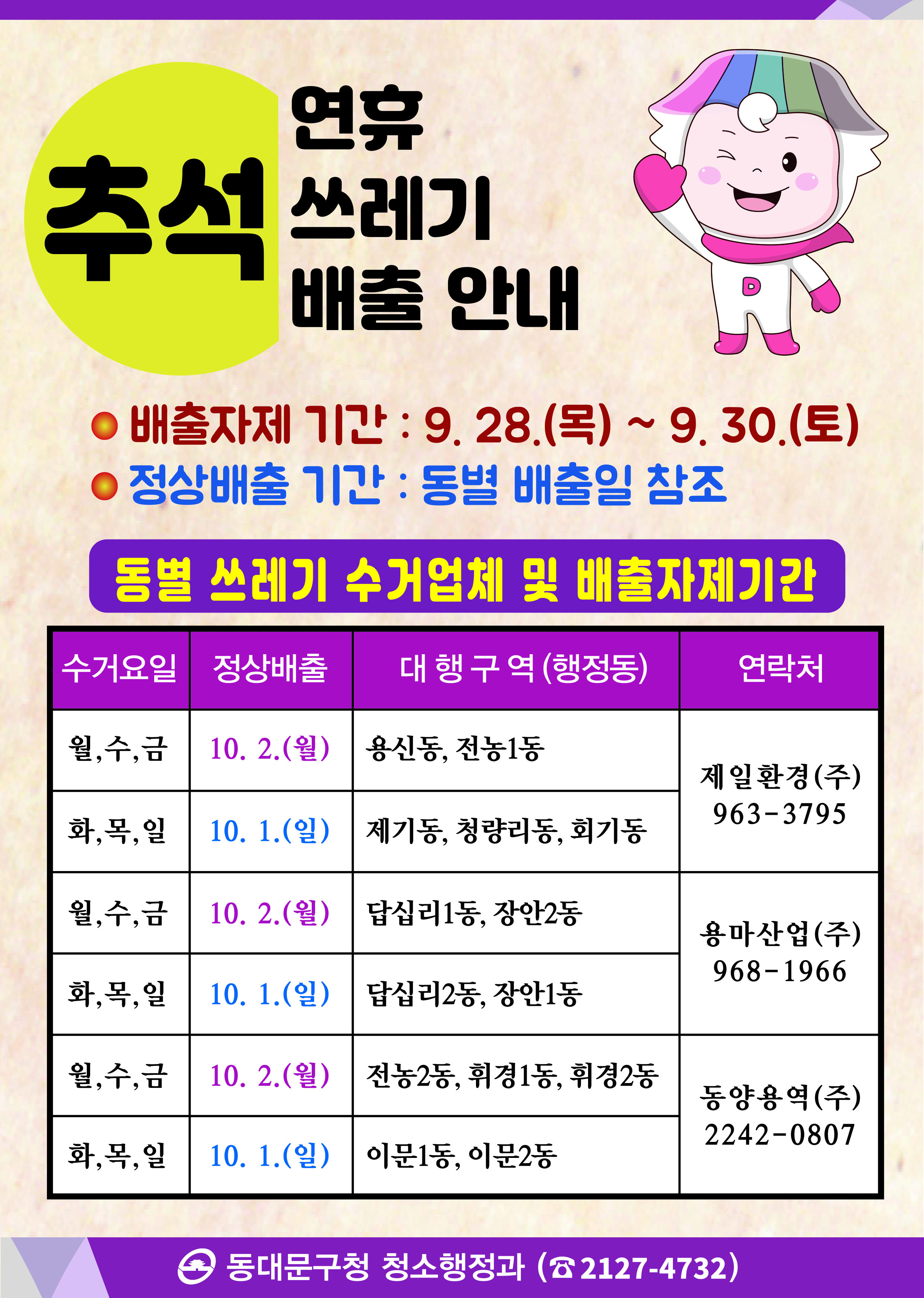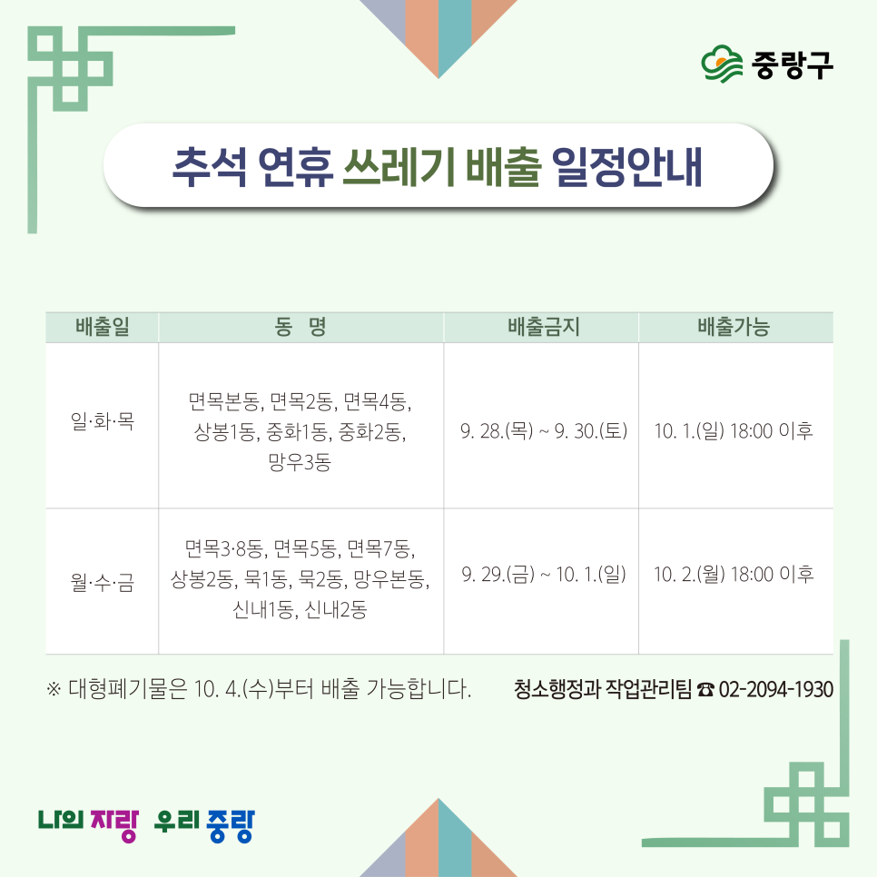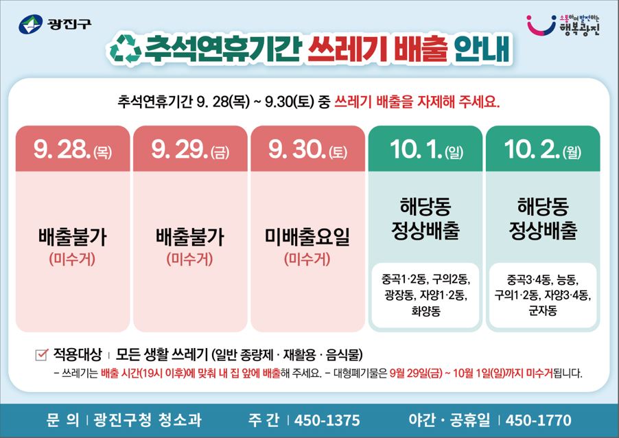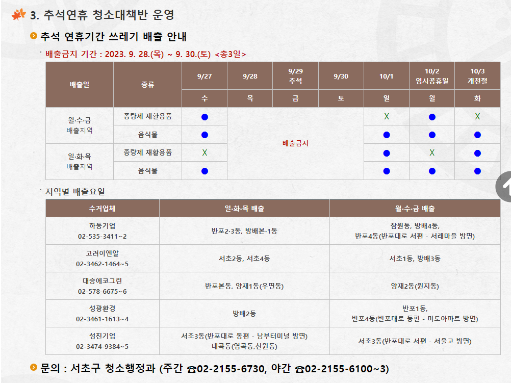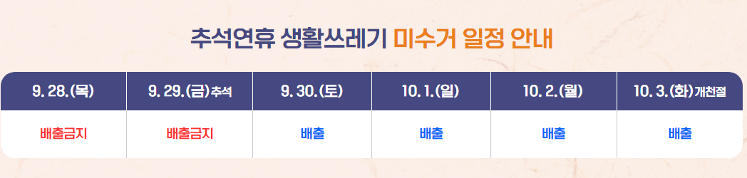 1) 추석 연휴 쓰레기 배출 일정 (종량제, 음식물쓰레기)